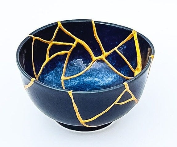 Kintsugi, a style of Japanese pottery, sees the beauty in brokenness. In the art of Kintsugi, an artist repairs broken pottery pieces by putting them back together with gold lacquer to create a new piece more beautiful and resilient than before.